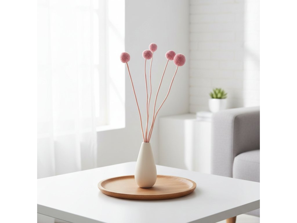 Craspedia je oblíbená pro svou dlouhou trvanlivost a bezúdržbovost. Výborně funguje jako solitér ve váze, ale i jako barevný akcent ve věncích, svatebních dekoracích či minimalistických interiérech.