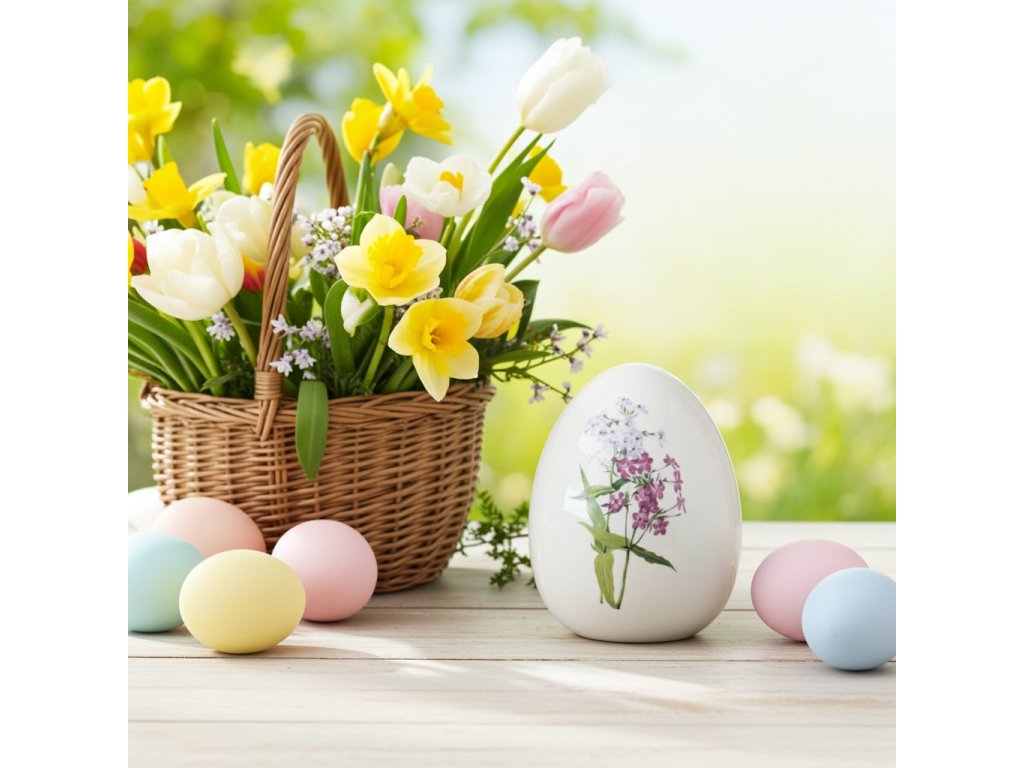 Bílé keramické vajíčko s jemným motivem jarních květin je stylovou dekorací, která vnese do vašeho domova svěžest a křehkou krásu jara. Hodí se jako samostatný doplněk na stůl, polici nebo jako součást velikonočního aranžmá, kde dokáže podtrhnout sváteční atmosféru a přírodní vzhled prostoru.