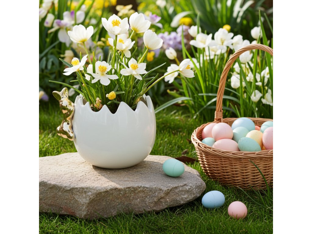 Keramický květináč ve tvaru skořápky s nepravidelně lomeným okrajem přináší autentický a originální vzhled. Zlatý zajíček dodává dekoraci slavnostní a luxusní nádech, díky čemuž je květináč ideální nejen pro jarní cibuloviny, ale i jako dekorativní prvek či praktický úložný prostor pro drobnosti.