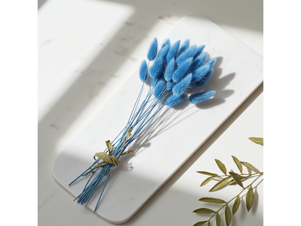 Modrý Lagurus přináší do aranžmá klidný tón a neobvyklý barevný nádech. Hebké klasy působí lehce a vzdušně, přesto dokážou dekoraci dodat charakter a osobitost. Právě kontrast mezi jemnou strukturou a chladným odstínem dělá z tohoto druhu sušené květiny zajímavý prvek pro moderní i přírodní kompozice.