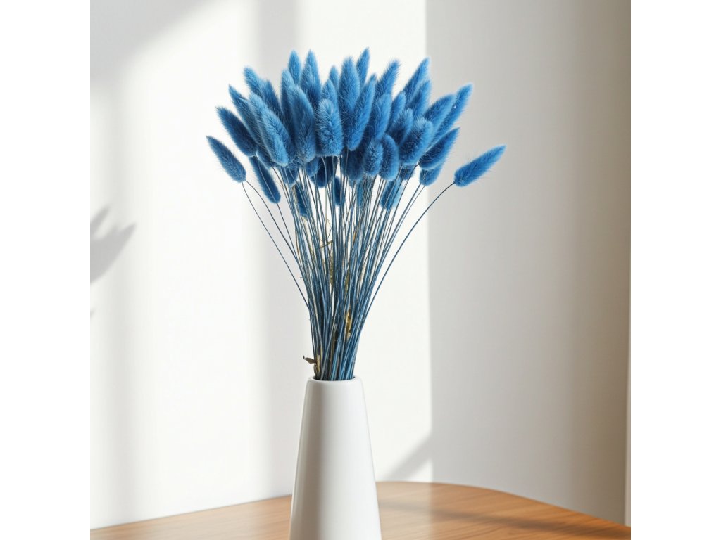 Využijete jej samostatně ve váze, kde vytvoří čistý a minimalistický dojem, nebo jako doplněk k dalším travinám či eukalyptu. Modrý Lagurus se skvěle hodí do interiérů s neutrální paletou barev, kde vynikne jako jemný, ale nepřehlédnutelný detail. Díky své lehkosti je ideální také pro kytice, věnce a kreativní projekty ze sušených květin.