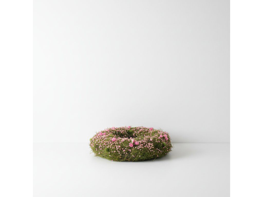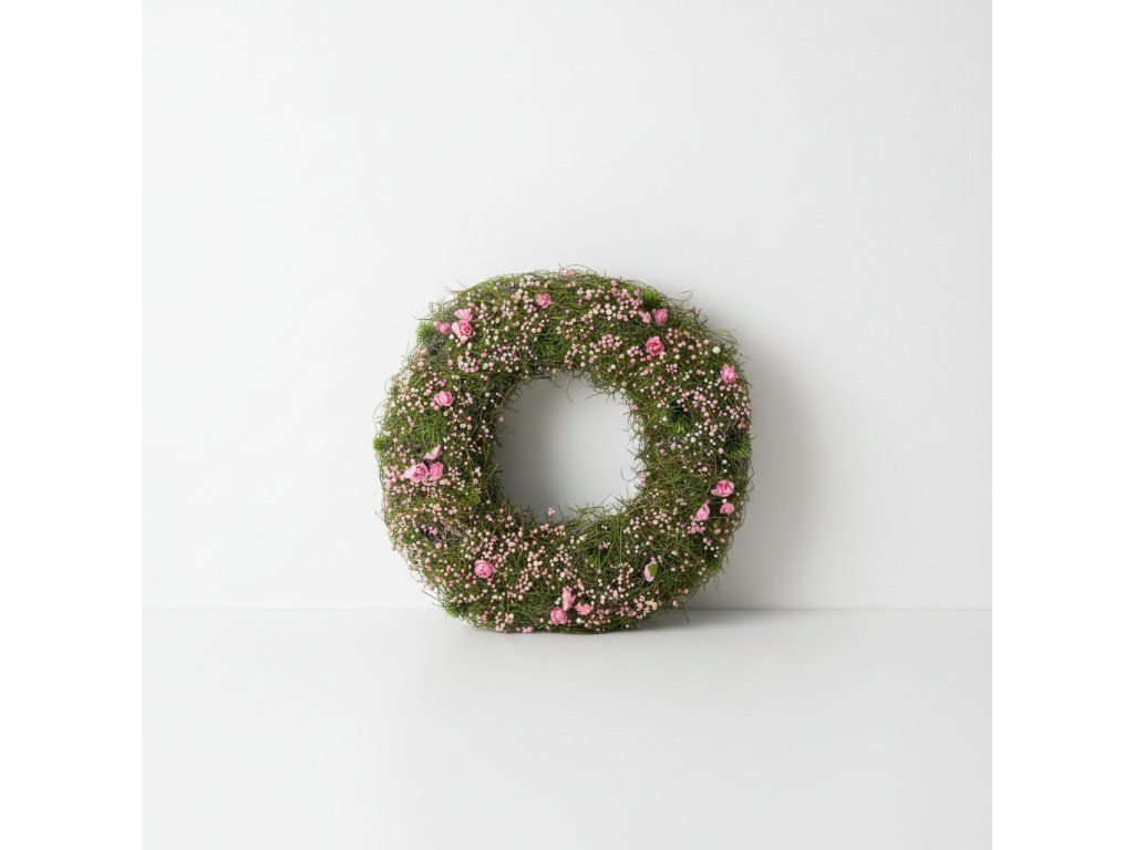 Velký letní věnec o průměru 35 cm je ideální dekorací pro ty, kdo chtějí do svého interiéru vnést jemnost, eleganci a svěží letní atmosféru. Kovový základ věnce je zdoben zeleným proutím, něžnými kvítky růžiček v pastelových růžových tónech a drobnými kuličkami v růžové a bílé barvě. Výsledkem je harmonická a půvabná kompozice, která působí romanticky, přirozeně a zároveň elegantně.