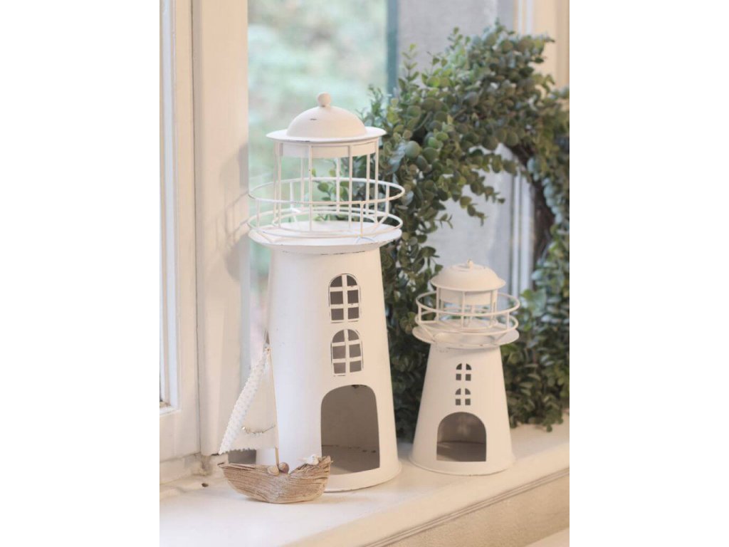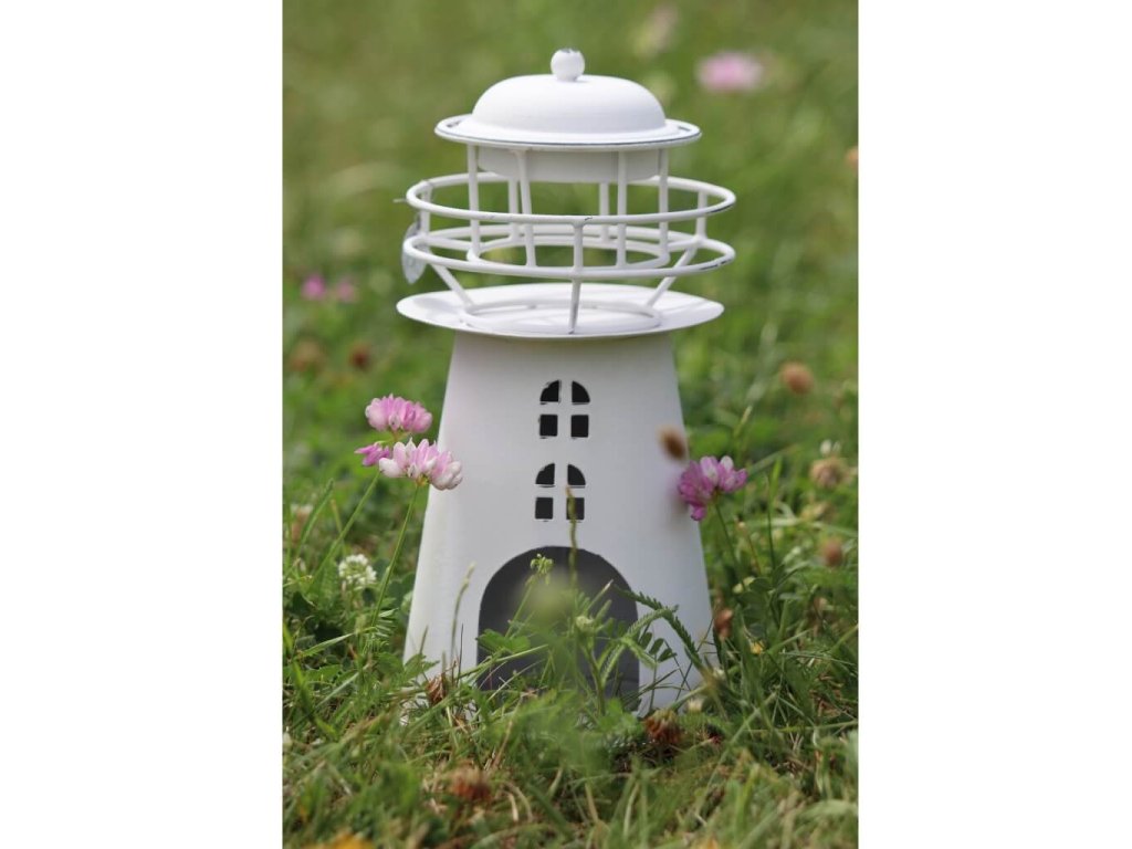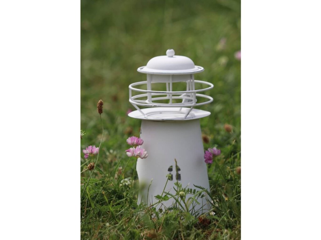 Bílá kovová lucerna ve tvaru majáku je ideálním doplňkem pro vytvoření útulné a klidné atmosféry. S výškou 24 cm slouží nejen jako dekorace, ale i jako praktický svícen pro čajové nebo LED svíčky, který rozzáří váš interiér jemným světlem.