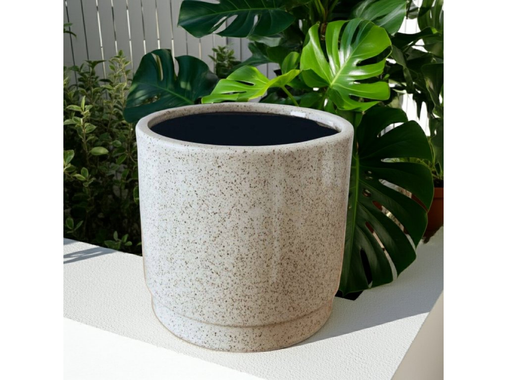 Keramický květináč v elegantní smetanové barvě s jemnými hnědými tečkami a černou výplní je ideální volbou pro středně velké rostliny, květiny či sukulenty, které potřebují více prostoru k růstu. Vyrobený z kvalitní keramiky, je pevný a odolný s dlouhou životností. Jeho přírodní a moderní design dokonale ladí s každým prostorem — v obývacím pokoji, na terase i zahradě.