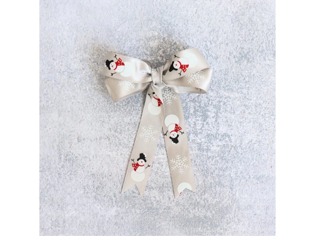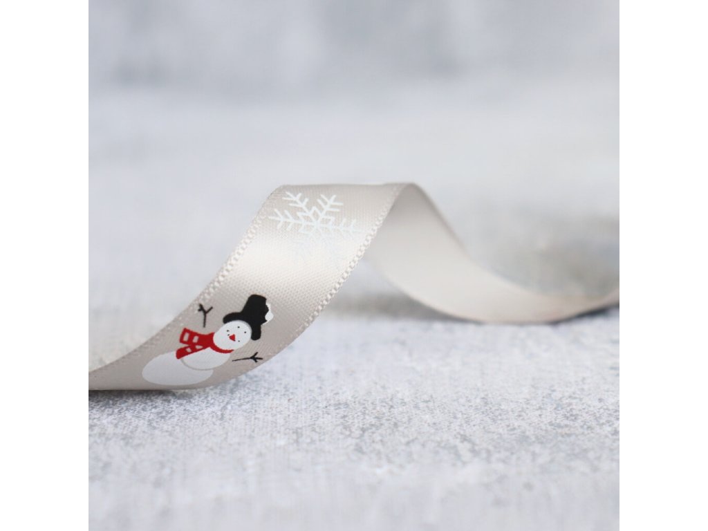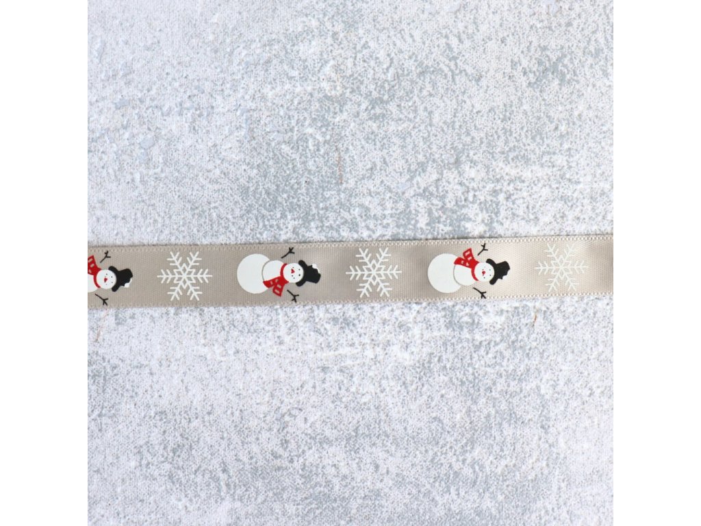 Tkaná plátnová stuha s motivem sněhuláka a vločky ve stříbrném provedení je ideálním doplňkem pro zimní a vánoční dekorace. Jemný vzor dodává aranžmá hravý, sváteční charakter a výzdobě slavnostní nádech.