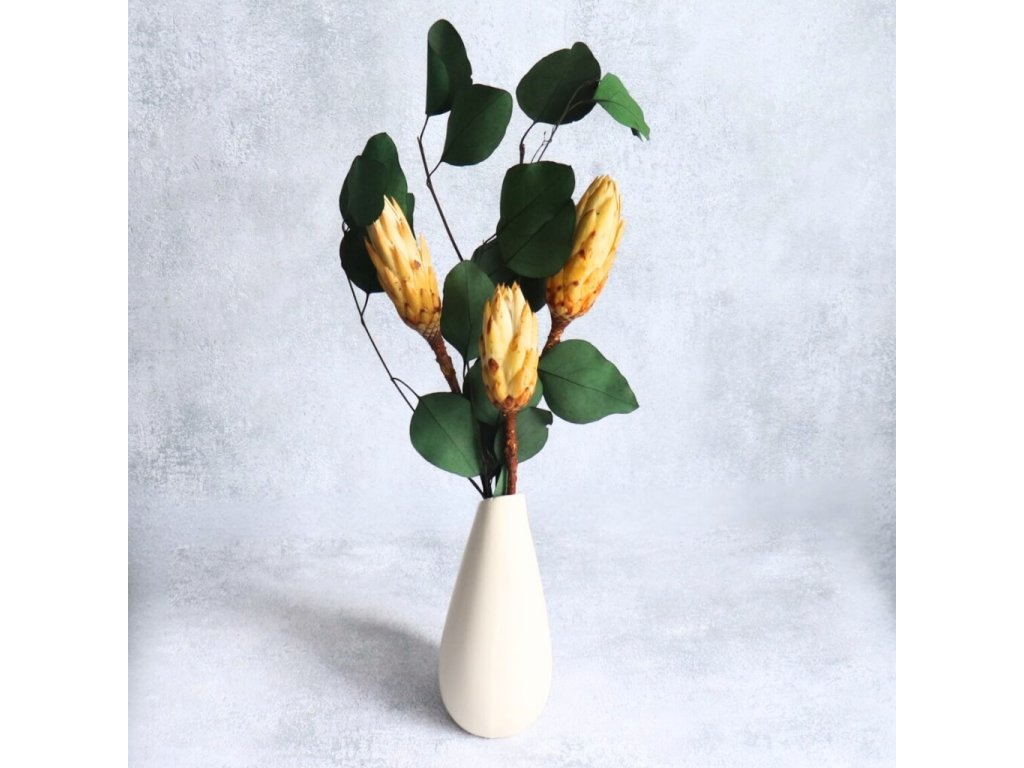 Díky neutrální smetanové barvě se Protea Repens snadno kombinuje s dalšími sušenými květinami, listy, stabilizovaným eukalyptem či dekorativními prvky. Je ideální pro moderní, rustikální i boho aranžmá a zachovává si svůj půvab po dlouhou dobu bez nutnosti péče.