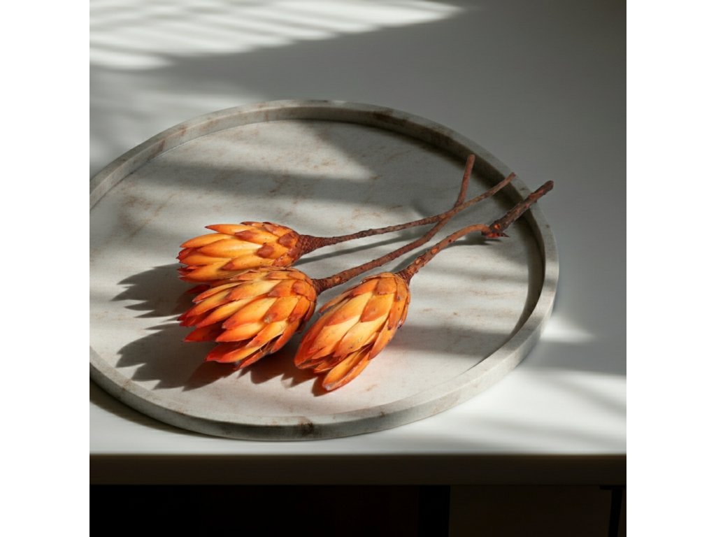 Oranžová Protea je ideální volbou pro podzimní i zimní aranžmá, ale stejně dobře vynikne i v celoročních přírodních kompozicích. Skvěle se kombinuje s neutrálními tóny a sušenými prvky, jako jsou oves, pšenice, eucalyptus nebo lagurus. Díky své trvanlivosti je perfektní pro dlouhodobé použití.