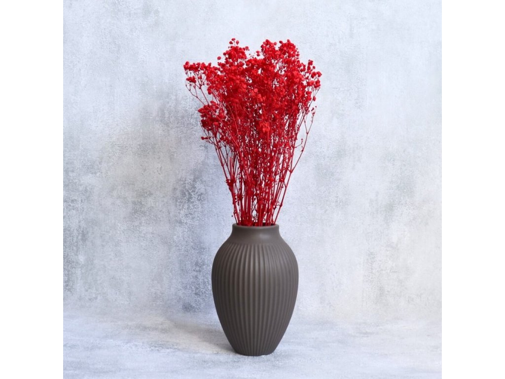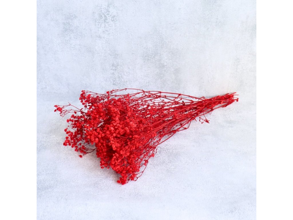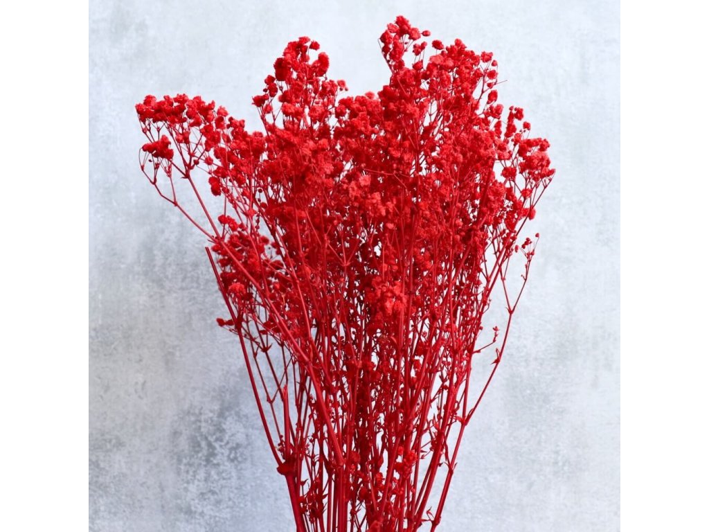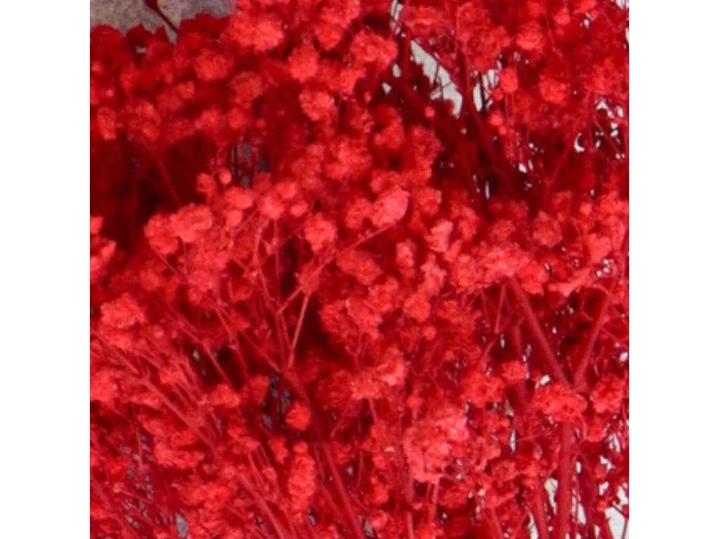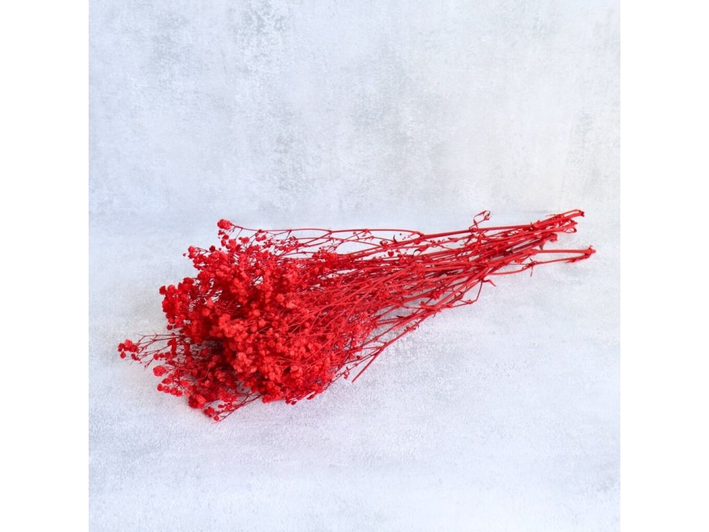 Červená stabilizovaná gypsophila přináší do vašich aranžmá živý a výrazný odstín, který symbolizuje vášeň, energii a lásku. Její jemné kvítky působí vzdušně a lehce, přitom ale dokážou každému dekoru dodat hloubku a intenzitu.