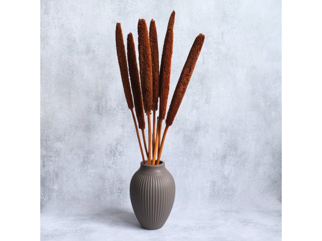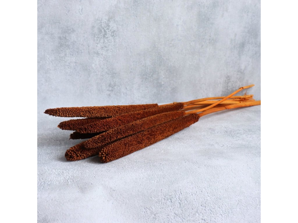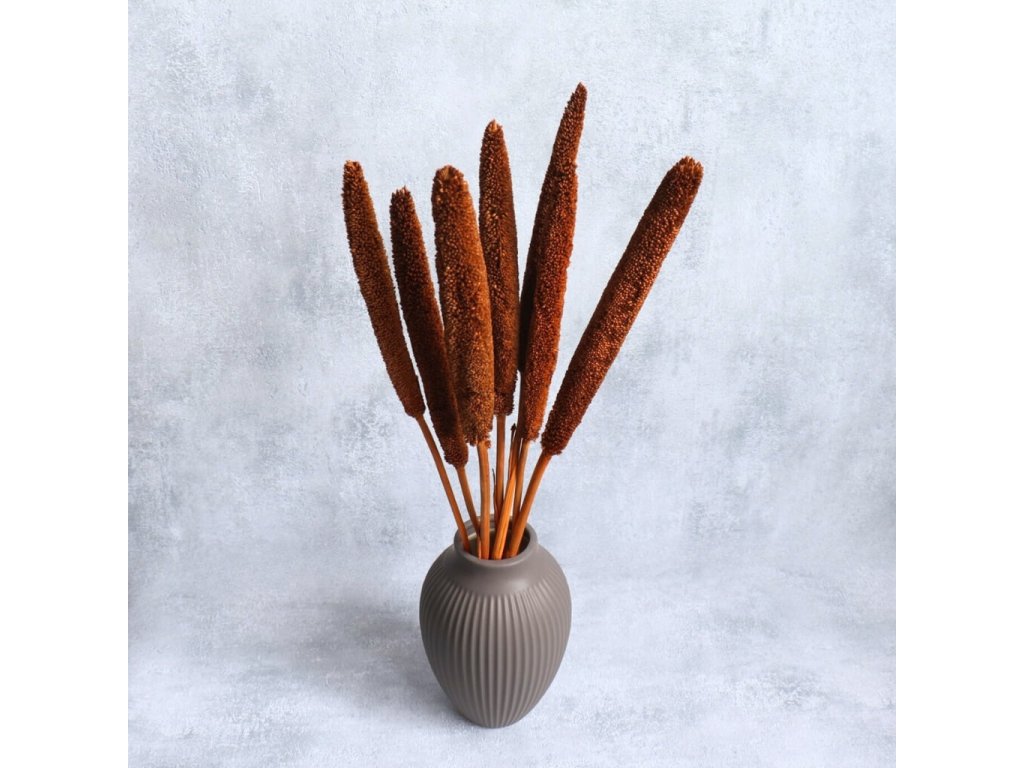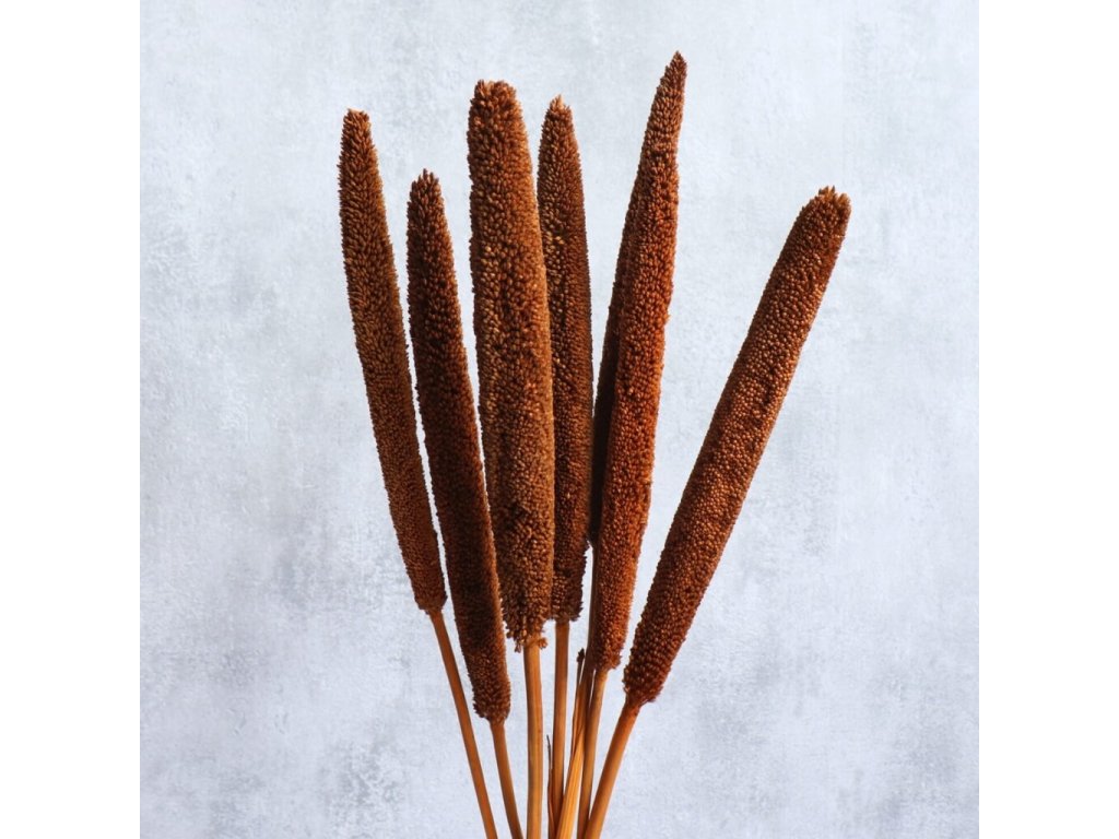Sušená Babala v odstínu terracotta vnese do vašich aranžmá teplé, zemitě oranžové tóny, které dokonale evokují atmosféru podzimu. Její štíhlé, podlouhlé klasy působí přirozeně a elegantně, a proto jsou oblíbeným prvkem v rustikálních, boho i moderních dekoracích.
