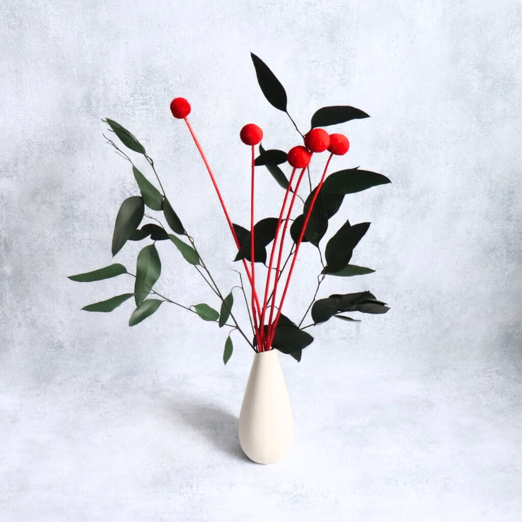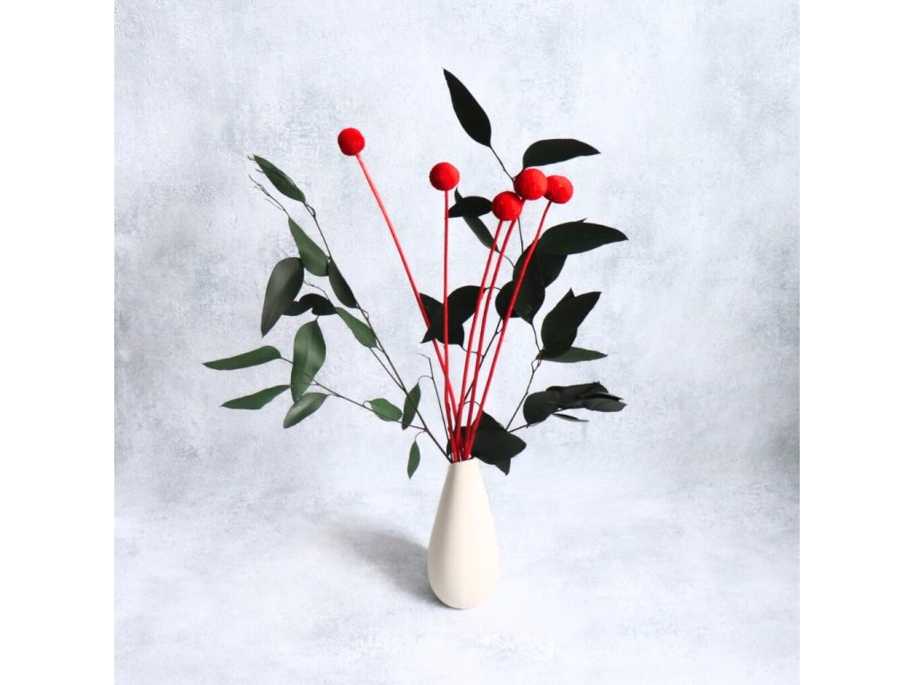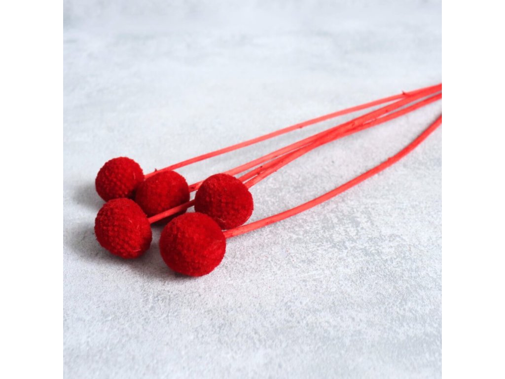 Sušená Craspedia v sytě červené barvě je ideálním prvkem pro svatební, sezónní i moderní dekorace. Její charakteristický kulatý tvar přidává aranžmá strukturu a vizuální zajímavost, zatímco červený odstín vnáší do prostoru energii a živost.