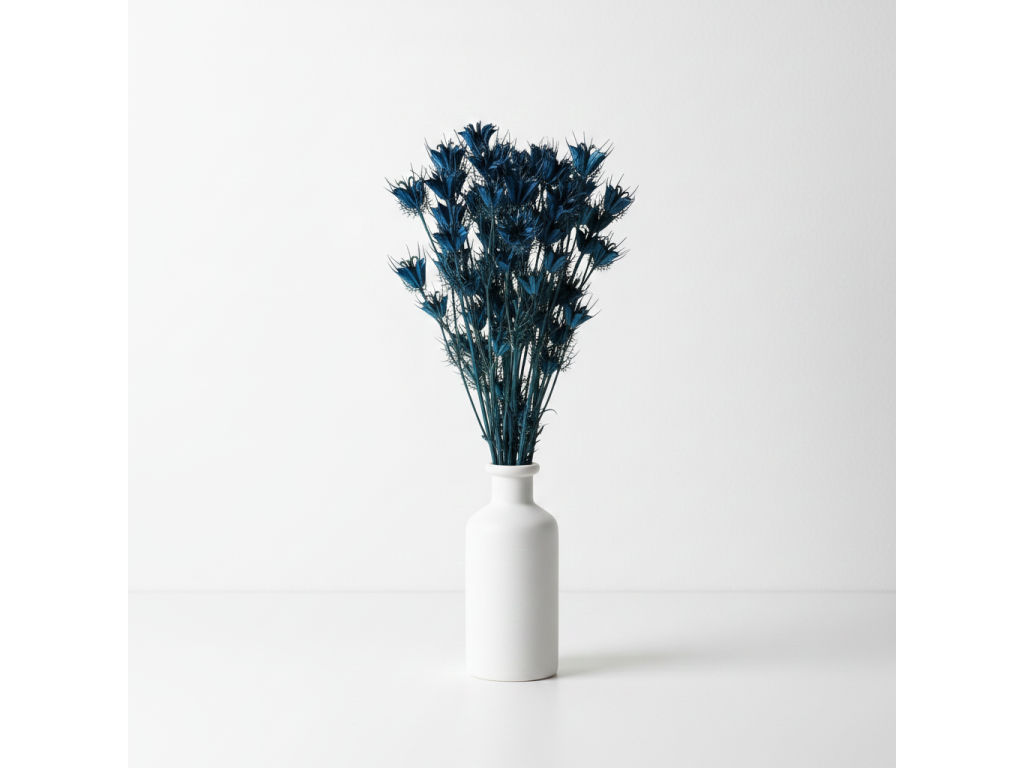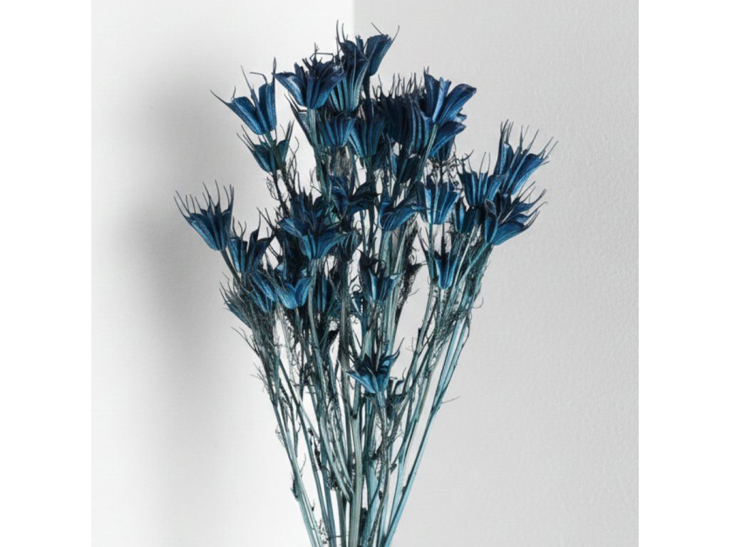 Tmavě modrá Nigella je skvělou volbou pro sušené kytice, věnce či sezónní dekorace. Vynikne samostatně i v kombinaci se světlými přírodními tóny pro jemný kontrast nebo s dalšími sytými barvami pro výrazný a dramatický efekt.