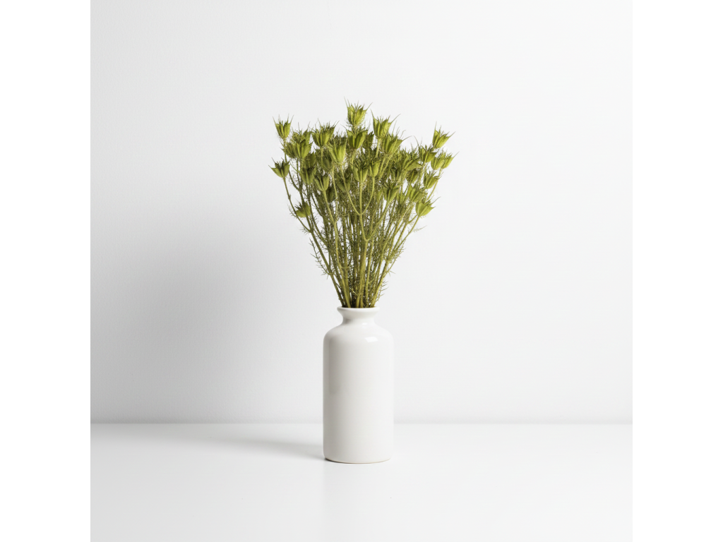 Tmavě zelená Nigella přináší do dekorací přírodní eleganci a zajímavou texturu. Její zvonečkové tobolky vytvářejí vzdušný efekt a působí přirozeně, takže dokonale doplní další sušené květiny, traviny i jiné přírodní materiály. Tmavší zelený odstín dodává aranžmá hloubku a harmonický kontrast, který zvýrazní barvy ostatních květin.