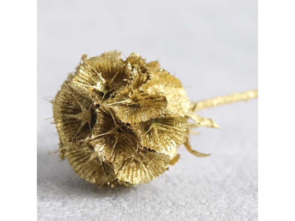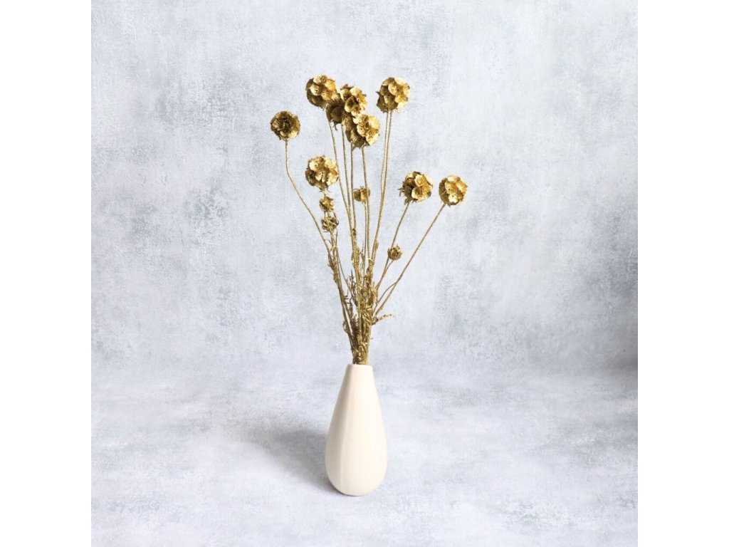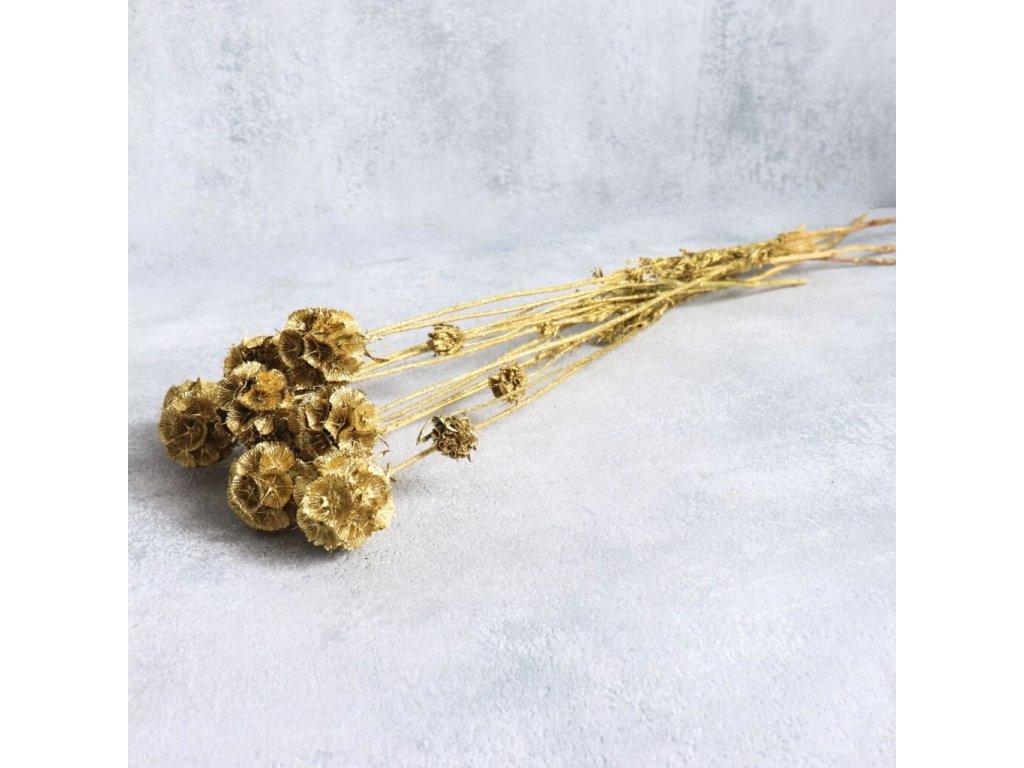 Sušená Scabiosa v elegantním zlatém odstínu vnese do vašich aranžmá nádech luxusu, tepla a slavnostní atmosféry. Její jemné kulaté hlavičky působí lehce a vzdušně, zatímco zlatý lesk dodá dekoracím sofistikovaný a okouzlující nádech.