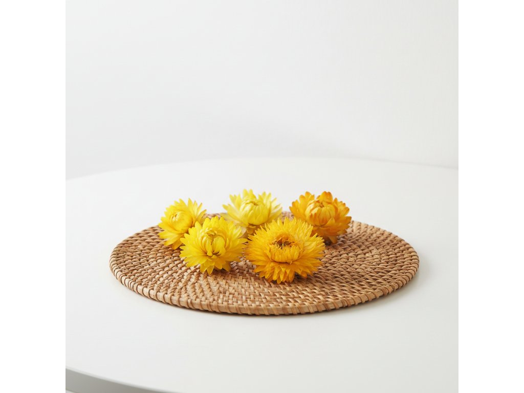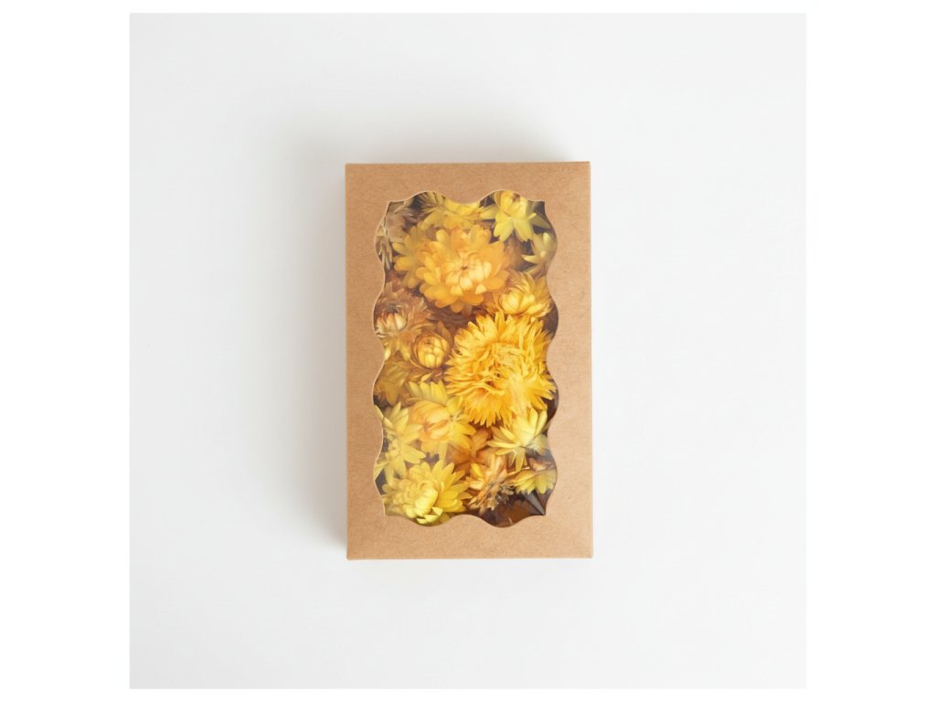 Žlutá slaměnka je oblíbená sušená květina, která dodá dekoracím příjemně teplý a přirozený tón. Různě velké květy vytvářejí zajímavý a harmonický celek, díky čemuž se hodí do jednoduchých i bohatších aranžmá.