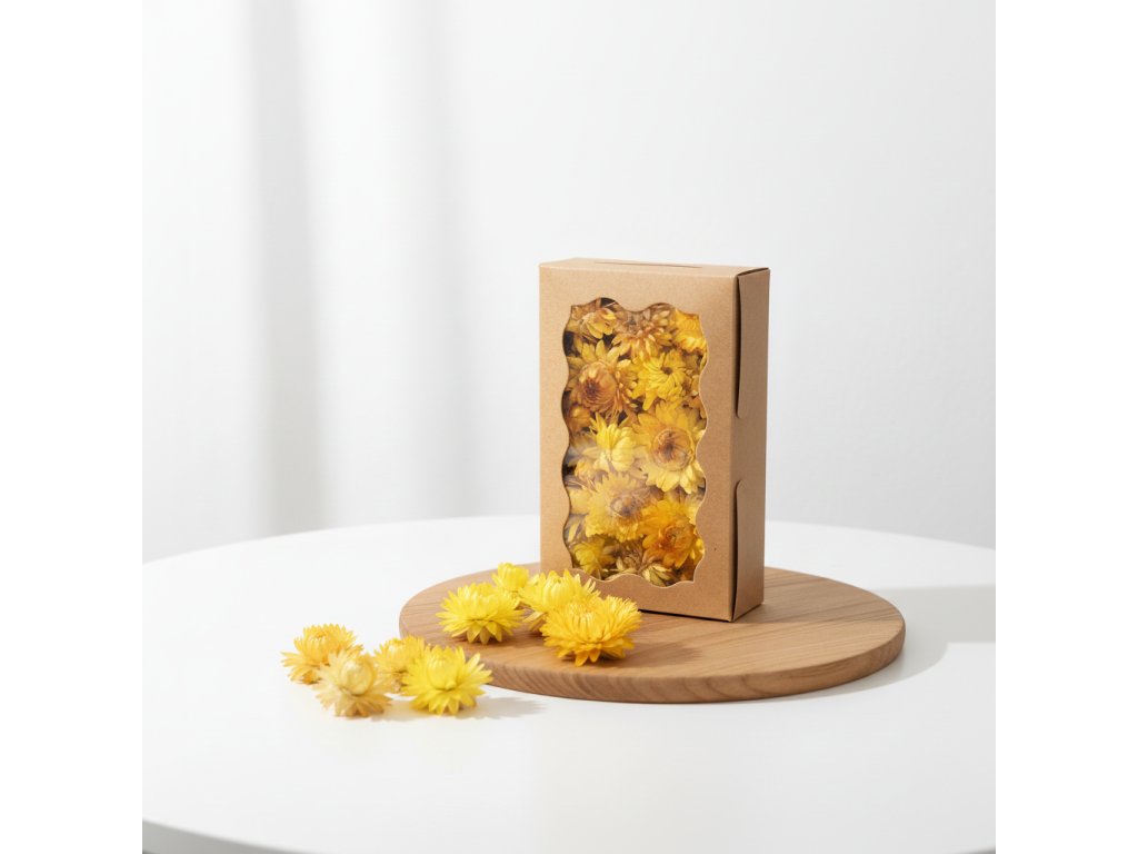 Výborně doplní sezónní dekorace, věnce, sušené kytice i drobné DIY projekty. Žlutý odstín dodává aranžmá slunečný vzhled a krásně se kombinuje s další sušinou i přírodními materiály.