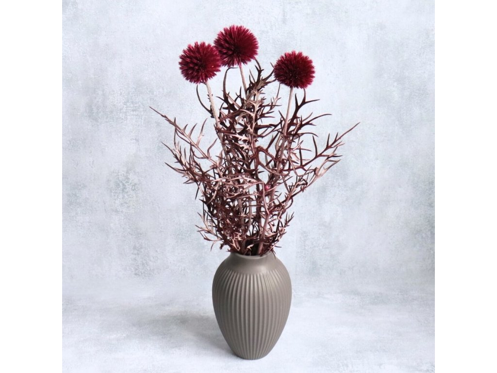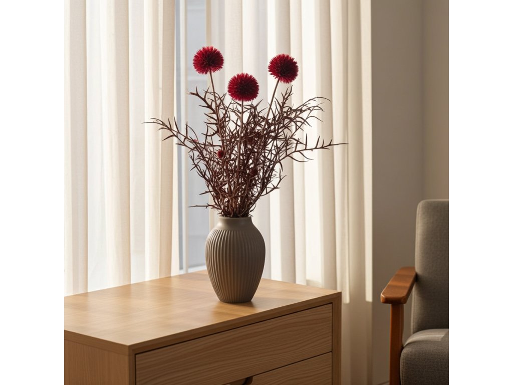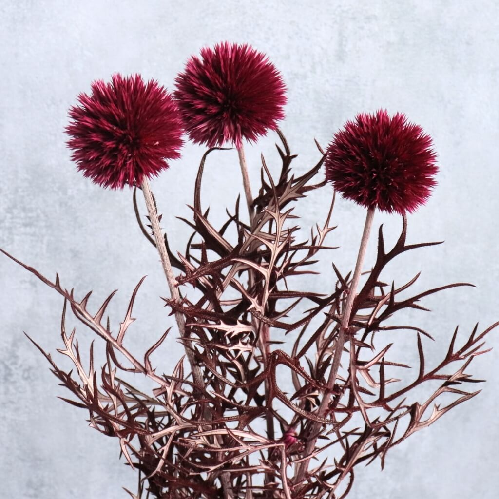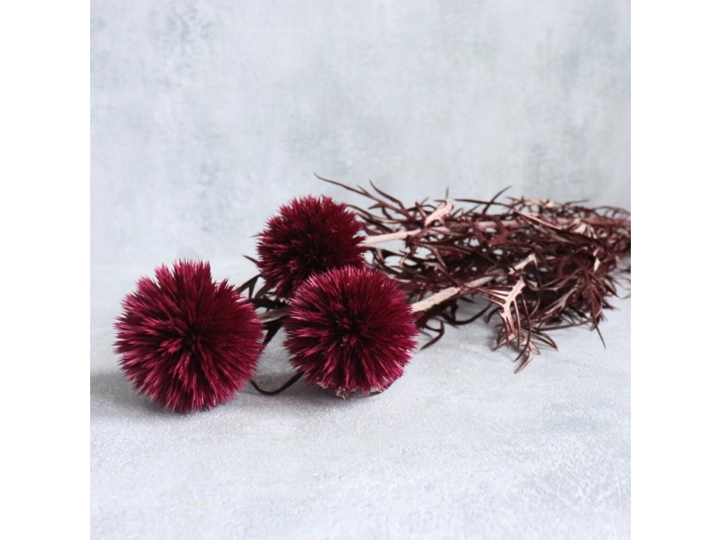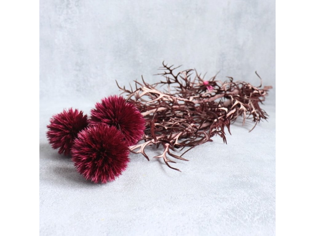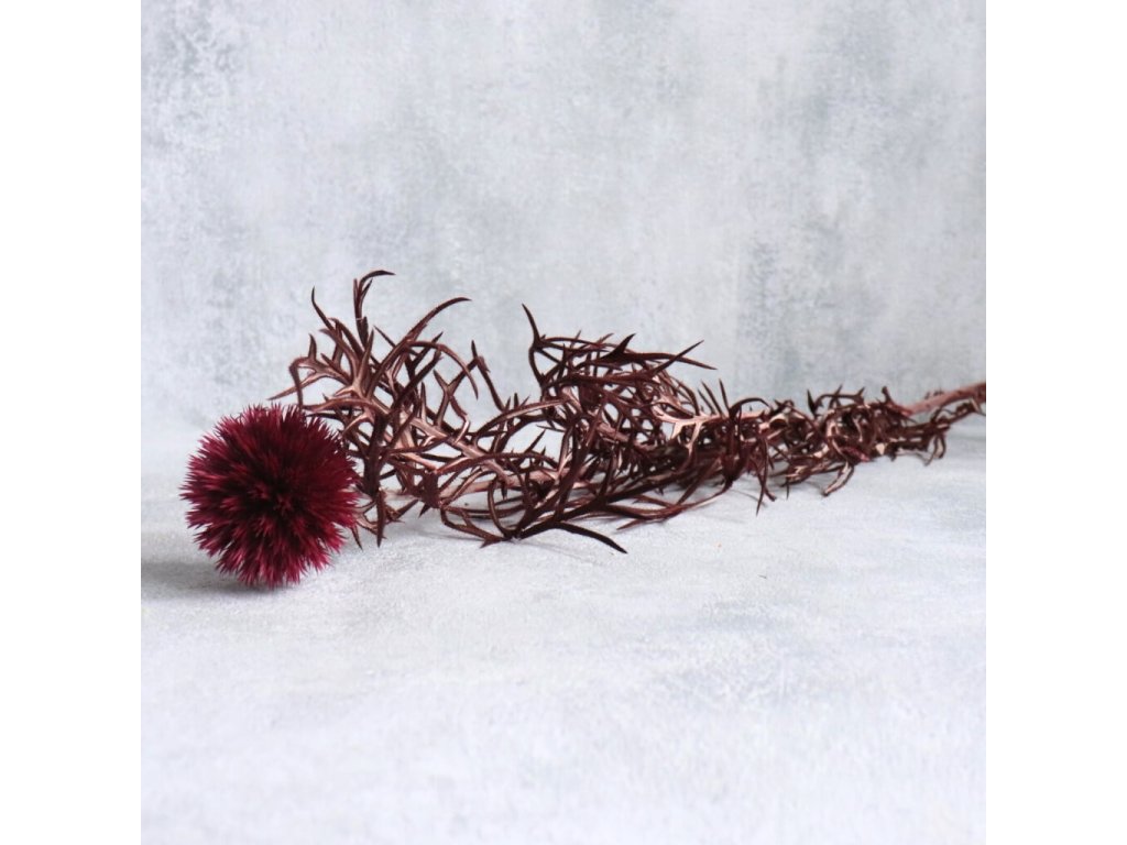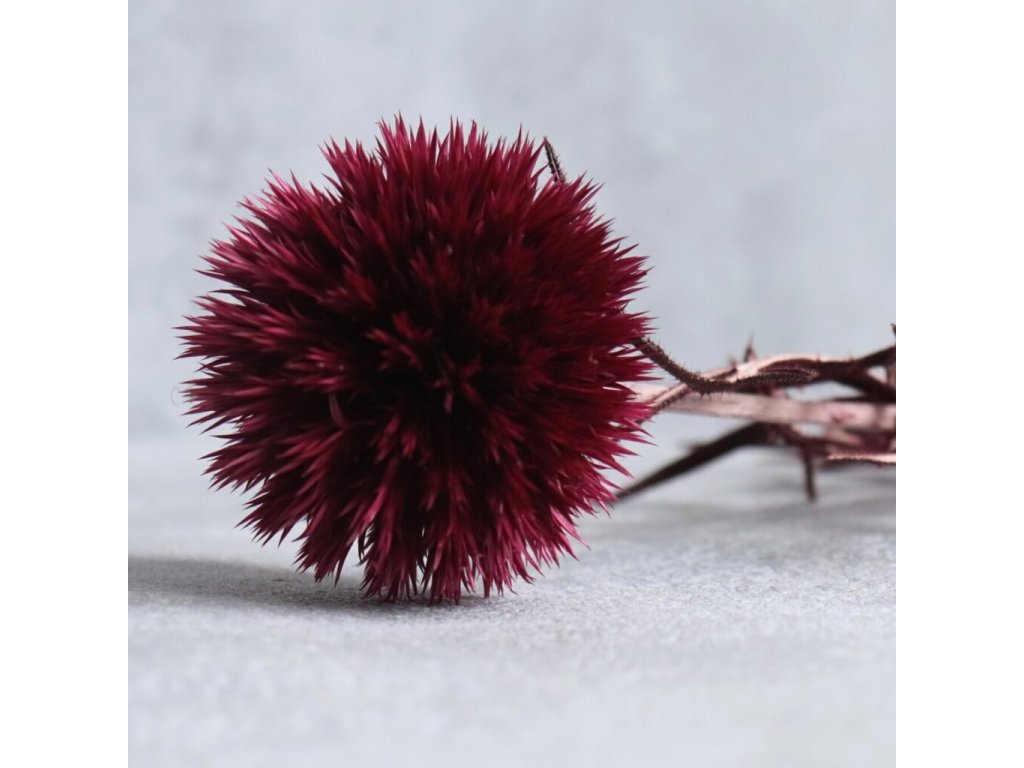 Sušený bodlák Echinops ve vínově-červeném odstínu je nepřehlédnutelným dekorativním prvkem, který vnese do aranžmá energii, kontrast a originalitu po celý rok. Jeho typické kulovité květy v syté barvě krásně oživí podzimní, jarní i sváteční kompozice a skvěle se kombinují s ostatními sušenými květinami, travinami, větvičkami, dekorativními doplňky nebo tematickými motivy.