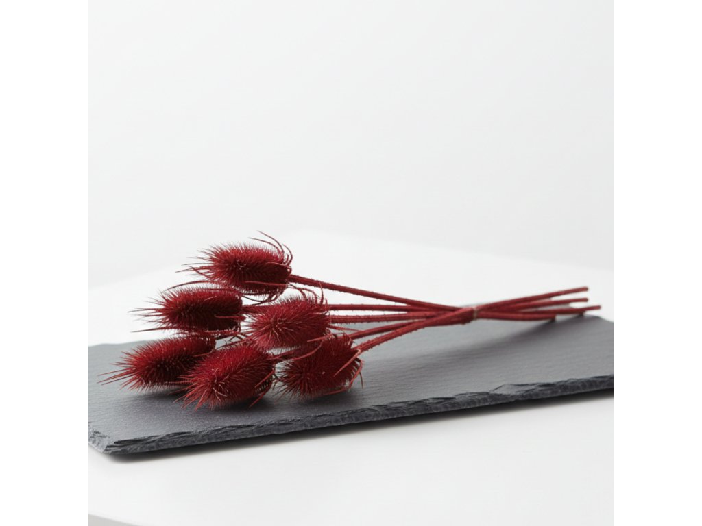 Sušený bodlák v bordo odstínu je nepřehlédnutelný doplněk do aranžmá. Jeho typická struktura dodává kompozici zajímavý kontrast a hloubku, zatímco tmavě vínová barva působí elegantně a lehce dramaticky.