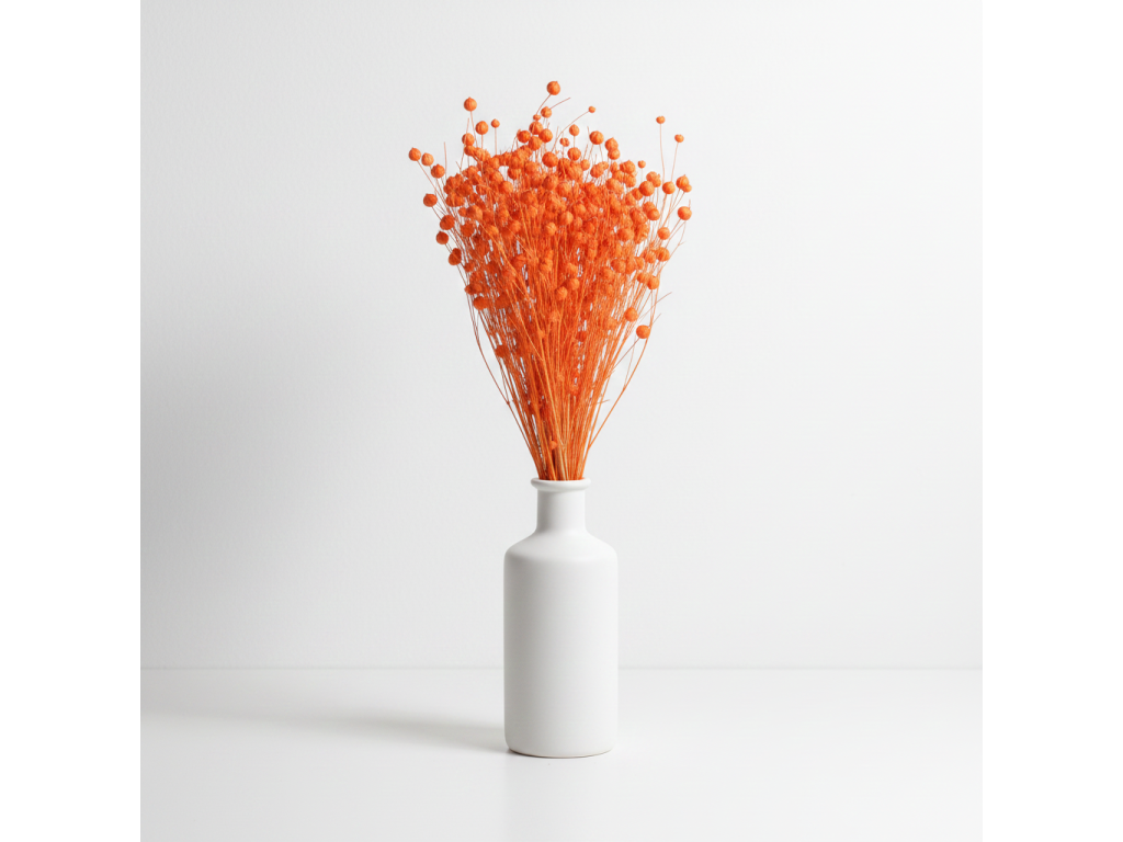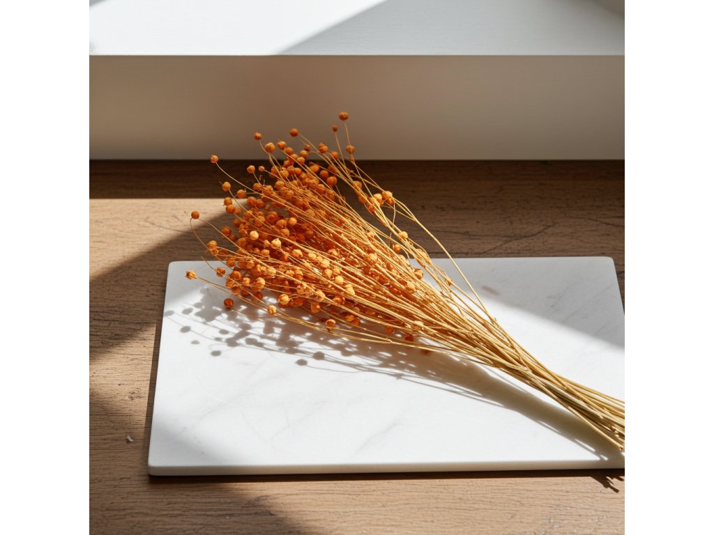 Sušené květiny dokážou proměnit každý prostor a dodat mu energii. Sušený len v oranžovém odstínu přináší do aranžmá teplý, slunečný tón, který působí radostně a přirozeně zároveň. Skvěle doplní moderní, boho i rustikální dekorace a vnese do kytic či aranžmá hřejivý nádech.