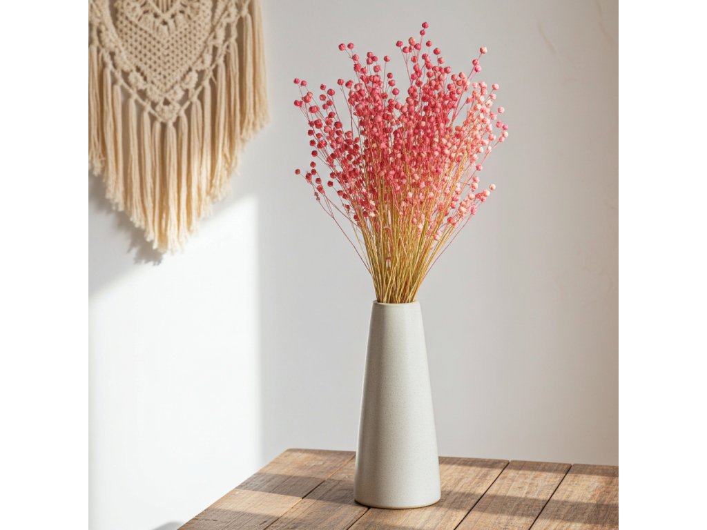 Sušené květiny mohou prostor změnit k nepoznání. Sušený len v růžovém odstínu vnese do dekorací jemnou něhu a romantickou atmosféru, která působí přirozeně a elegantně. Tento tón dodává aranžmá živost, aniž by rušil harmonii interiéru, a je ideální pro ty, kteří hledají dekoraci s jemným, ale výrazným efektem.