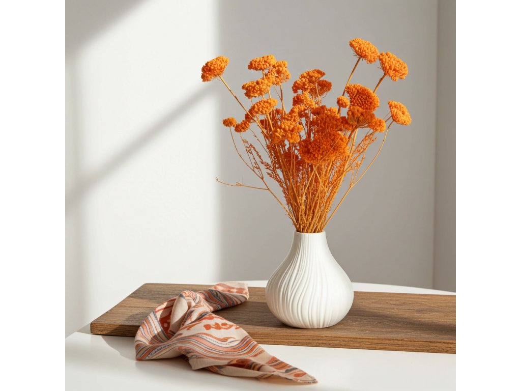 Sušená Achillea v odstínu albicocca patří mezi sušené květiny, které do interiéru vnášejí jemnost, teplo a přirozenou eleganci. Tento sušený květ v meruňkovém tónu krásně oživí aranžmá a dodá mu lehký romantický nádech, aniž by působil přehnaně výrazně.