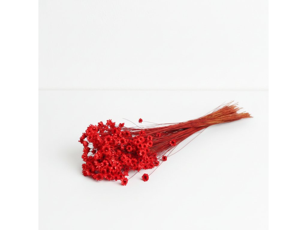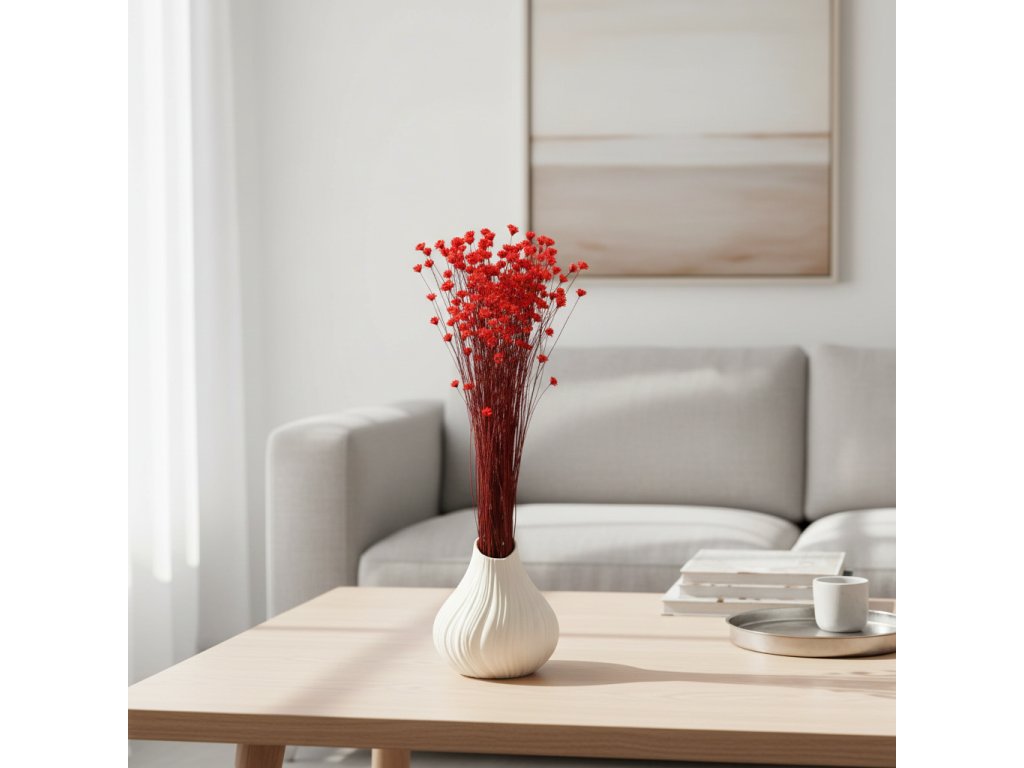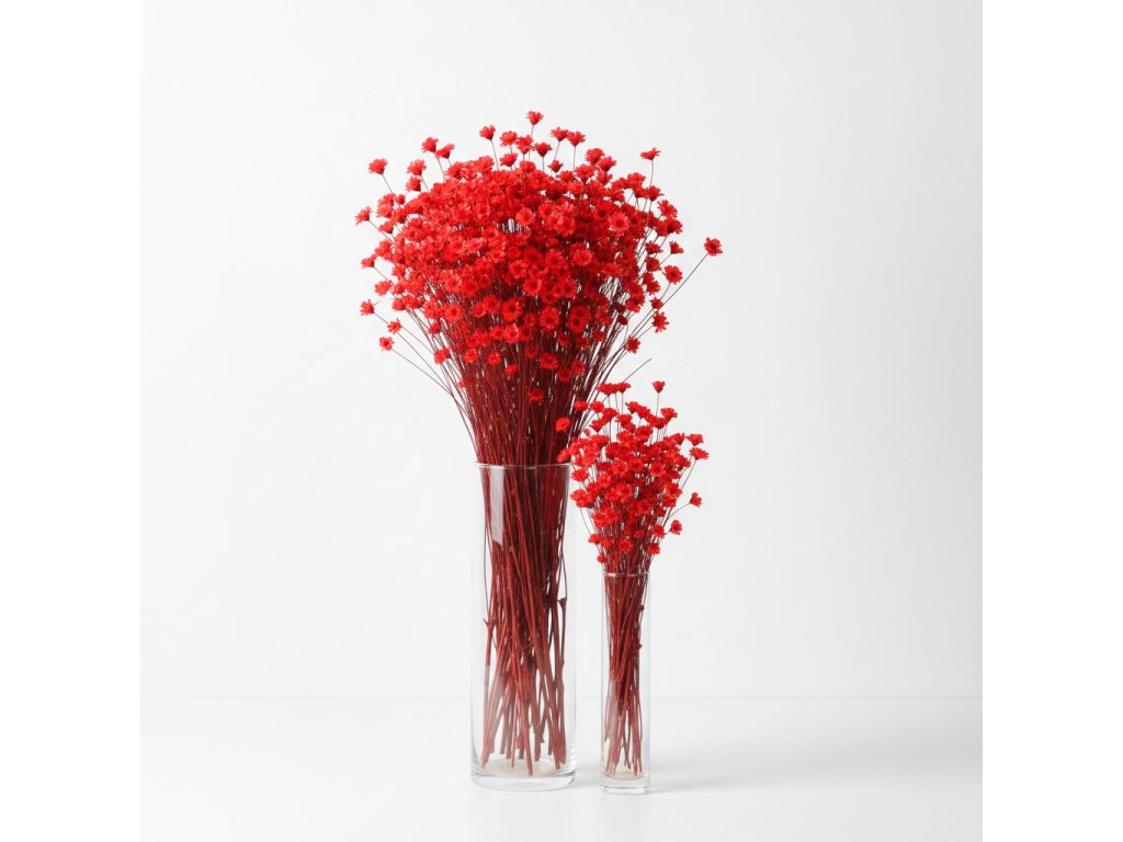 Sušená Glixia v sytě červené barvě přináší do aranžmá energii, eleganci a okamžitou vizuální atraktivitu. Její drobné, husté kvítky vytvářejí bohatou a vzdušnou strukturu, která působí přirozeně a elegantně. Červená barva je ideální pro zvýraznění detailů, kontrastní kombinace s neutrálními sušenými květinami nebo pro sváteční a romantická aranžmá.