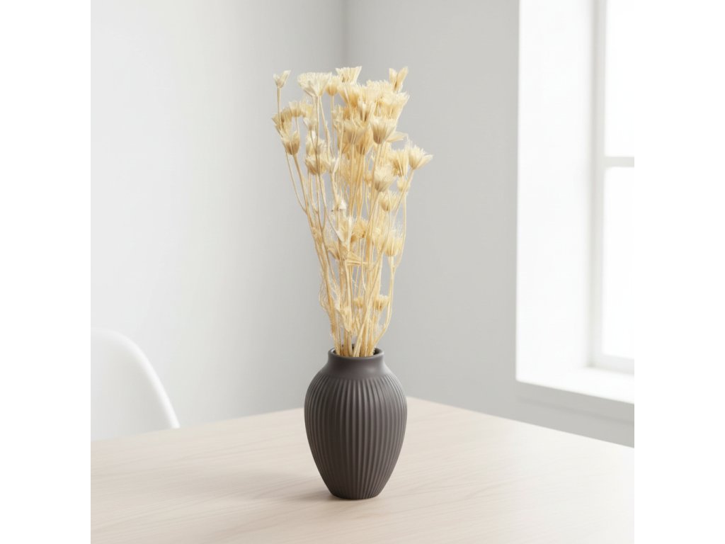 Bílá Nigella působí jako tichý, ale výrazný designový prvek. Její jemné tobolky vytvářejí vzdušnou siluetu, která interiér nezahltí, ale naopak mu dodá eleganci a lehkost. Minimalistická bílá barva nechává vyniknout tvary a přirozenou strukturu sušených květin.