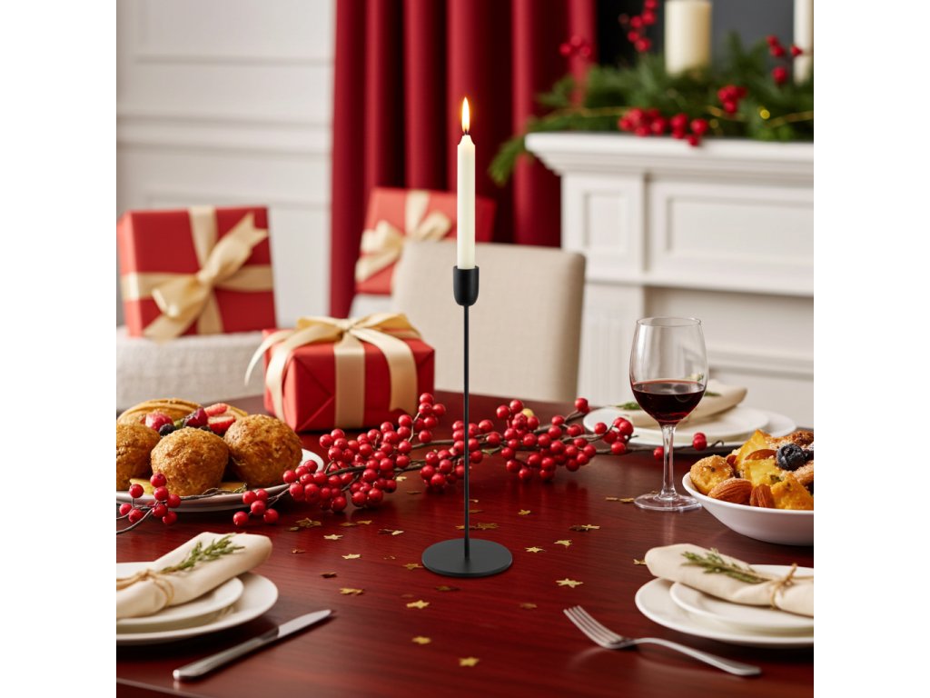 Černý kovový svícen na nožce je nadčasový doplněk, který dodá prostoru styl a slavnostní atmosféru. Je ideální pro vysoké a kónické svíčky a skvěle se hodí jak pro běžné domácí použití, tak pro speciální příležitosti – svatby, večerní stolování, vánoční dekorace či elegantní aranžmá v interiéru.