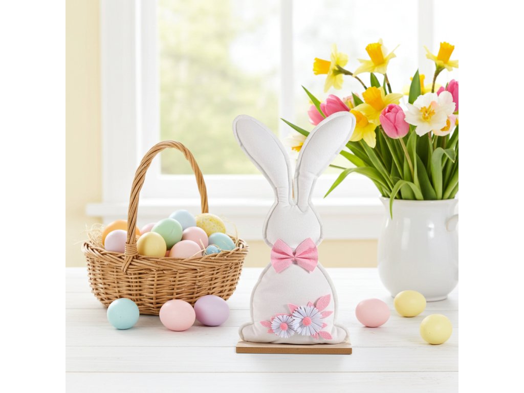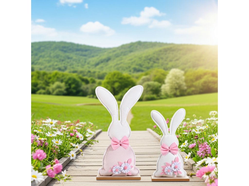 Každý zajíc je umístěn na stabilním dřevěném podstavci, což zajišťuje pevnost a přidává dekoraci přírodní, rustikální prvek. Dekoraci doplňují bílá kvítka a růžové filcové mašle, které podtrhují něžný a hravý vzhled. Sada se hodí do moderních i tradičně zařízených interiérů a snadno vykouzlí sváteční atmosféru plnou radosti.