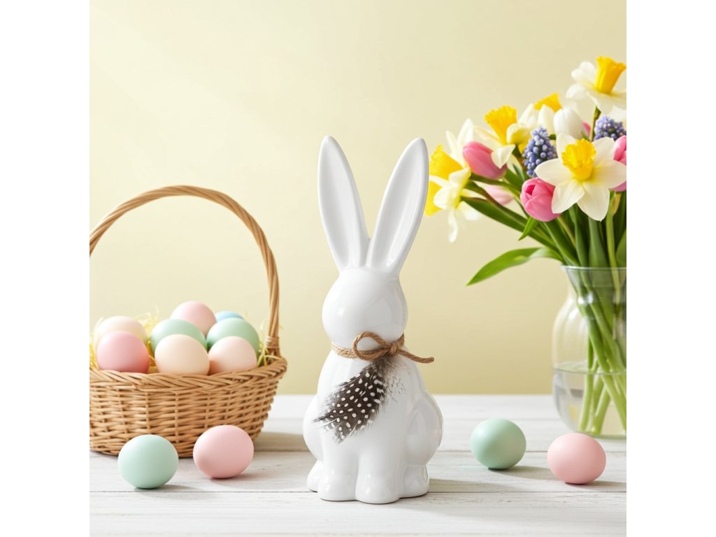 Porcelánová figurka zajíce o výšce 13 cm přináší do vašeho domova lehkost a sofistikovanou jarní atmosféru. Bílý porcelán doplňuje dekorativní peříčko a jutový provázek, které dodávají figurce přírodní a elegantní nádech, ideální pro jarní a velikonoční aranžmá.