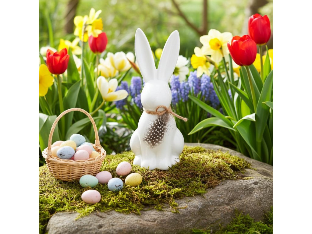 Porcelánová figurka zajíce o výšce 17 cm přináší do vašeho domova jemnou eleganci a svěží jarní atmosféru. Bílý porcelán doplňuje dekorativní peříčko, které dodává figurce lehkost a přírodní nádech, ideální pro jarní a velikonoční aranžmá.