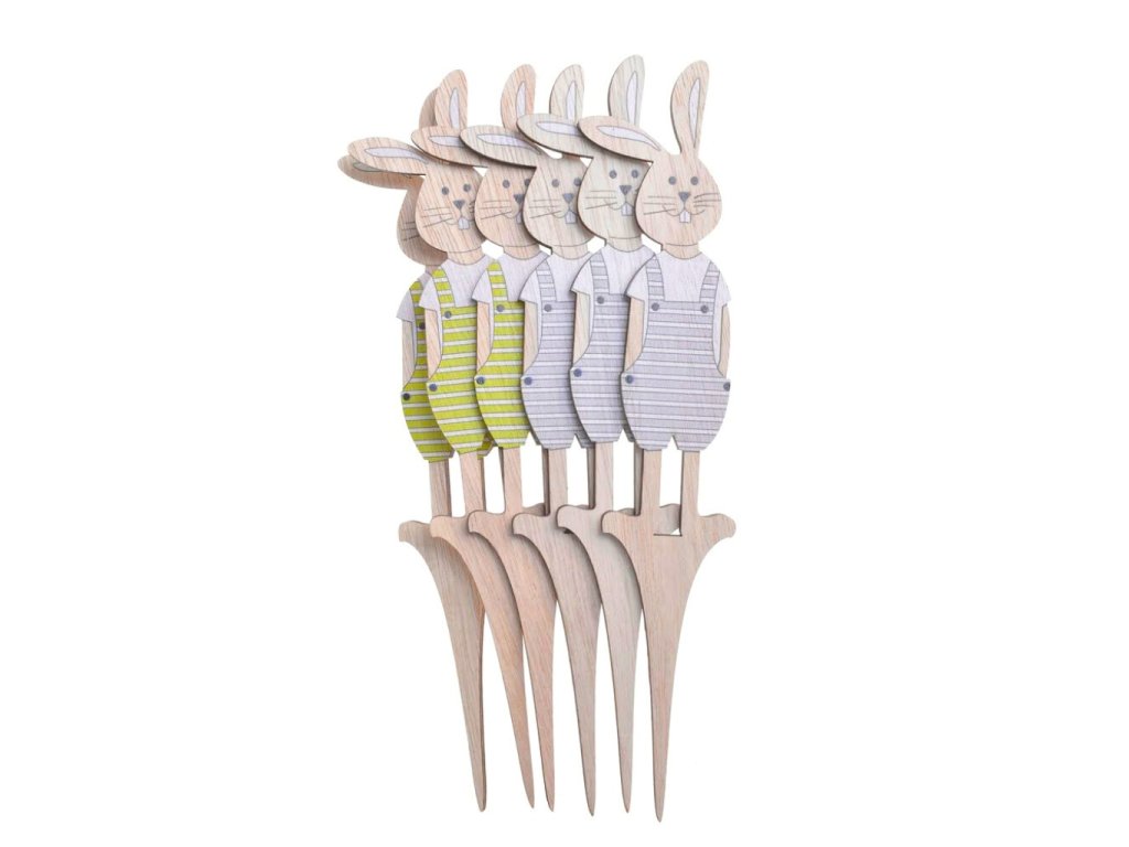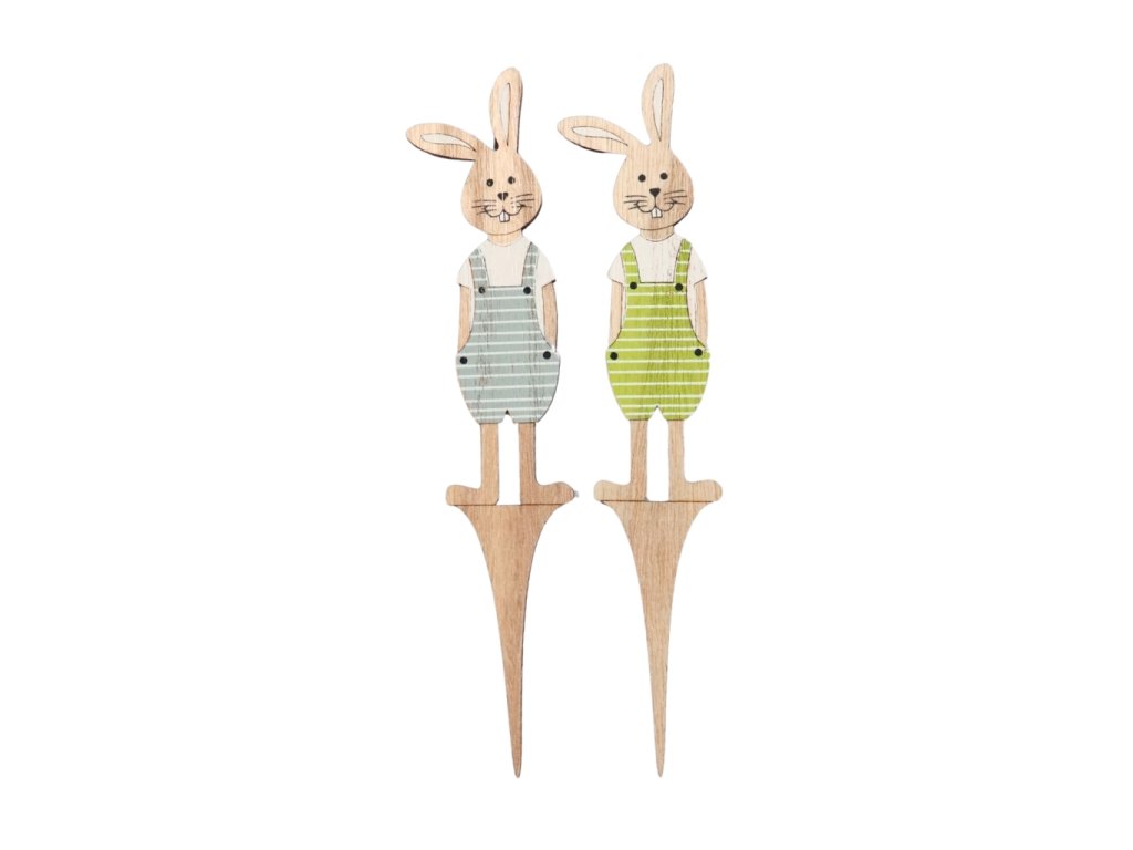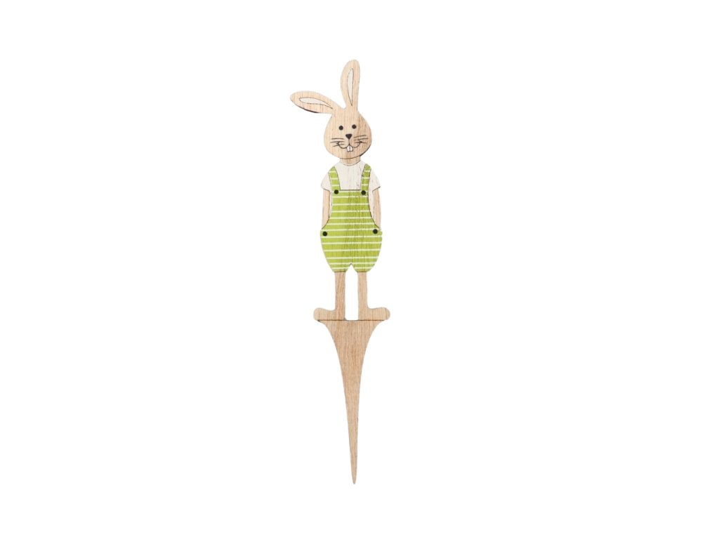Roztomilý dřevěný zápich ve tvaru zajíčka v kalhotách je krásným doplňkem do jarní a velikonoční výzdoby. Jemné barevné provedení v šedé nebo zelené působí elegantně a nadčasově, díky čemuž se snadno kombinuje s moderními i rustikálními aranžmá.