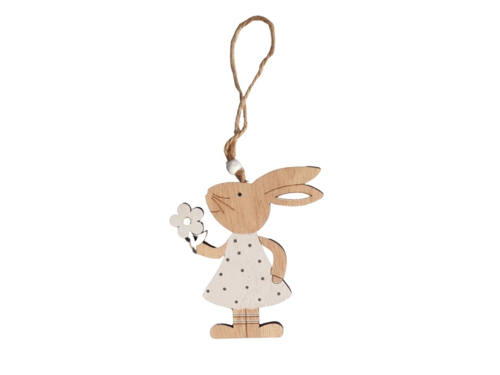 Dřevěný závěsný zajíček o velikosti 9,5 cm s kytičkou je krásnou dekorací pro jarní a velikonoční výzdobu. Jeho jednoduché a přírodní provedení působí lehce a nadčasově a snadno se kombinuje s dalšími dekoracemi z přírodních materiálů.